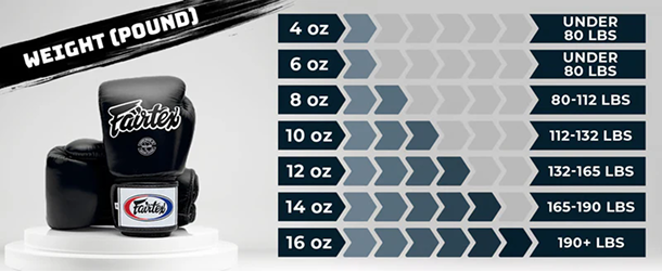 Coach Tip: 16oz for sparring (required at most gyms), 14oz for pad work, 12oz for competition weight classes