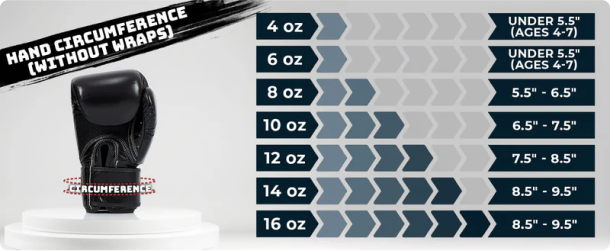 16oz works for most training including sparring and heavy bags. 14oz suits pad work and technique training. 12oz is for speed drills and competition use.