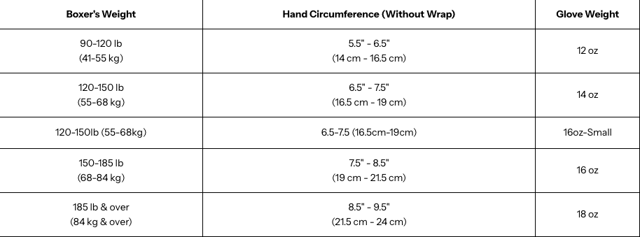 16oz works for most training including sparring and heavy bags. 14oz suits pad work and technique training. 12oz is for speed drills and competition use.